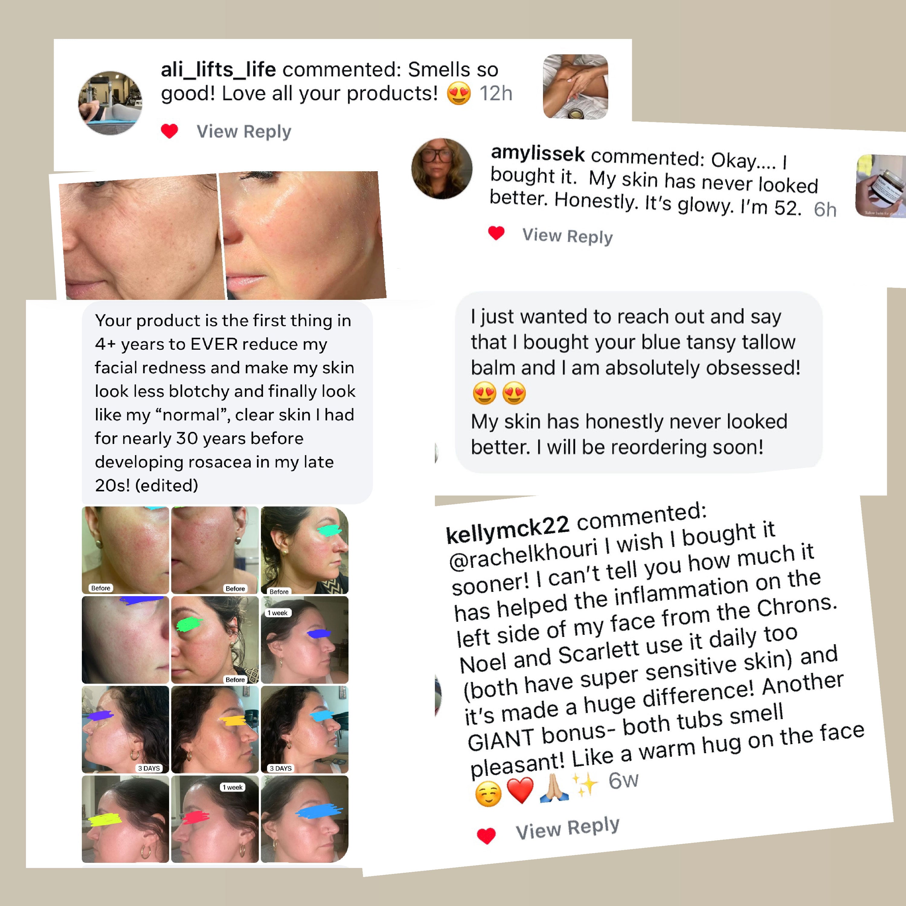 From the calming properties of blue tansy oil to the soothing richness of grass-fed tallow, each element is chosen for its ability to nurture your skin.